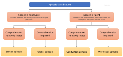 | Global aphasia | Large lesion affecting all 3 of the above areas resulting in severe expressive and receptive aphasia |