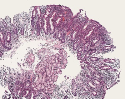 Duodenal biopsy from a patient with coeliac disease. Complete atrophy of the villi with flat mucosa and marked crypt hyperplasia. Intraepithelial lymphocytosis. Dense mixed inflammatory infiltrate in the lamina propria.