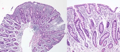 Duodenal biopsy from a patient with coeliac disease. Flat mucosa with hyperplastic crypts and dense cellular infiltrate in the lamina propria. Increased number of intraepithelial lymphocytes and vacuolated superficial epithelial cell vacuolated superficial epithelial cells. Higher magnification image on the right.