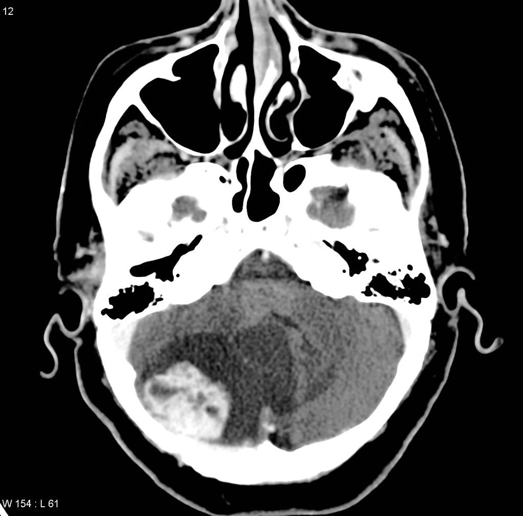 CT scan showing a cerebellar haemangioma in a patient with Von Hippel-Lindau syndrome.