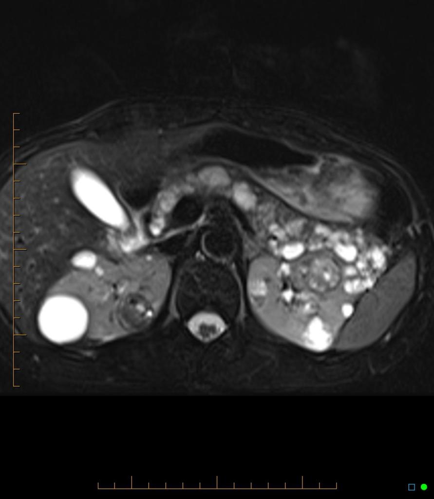 MRI showing renal cysts in patient with known Von Hippel-Lindau syndrome.